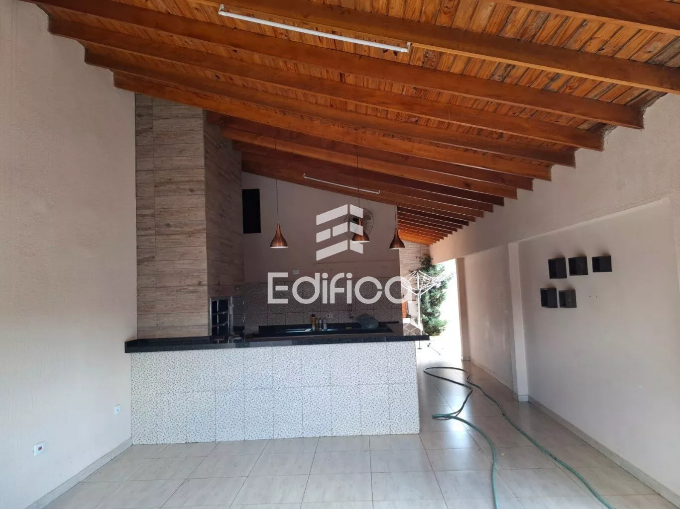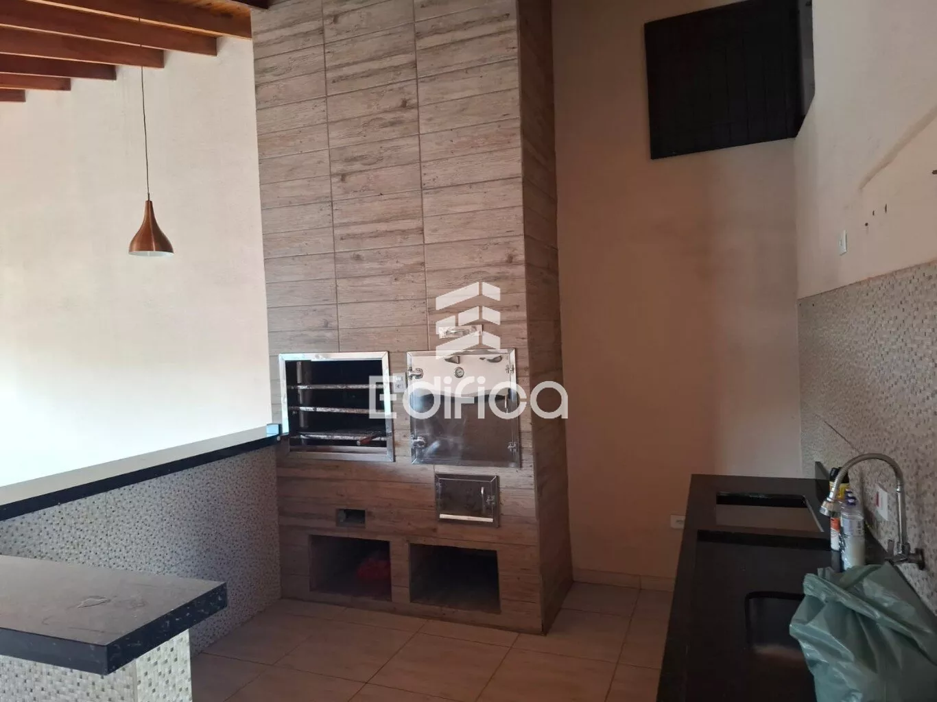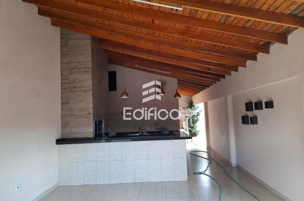 Casa com 01 suite + 02 dormitórios, banheiro social, sala, cozinha, área serviço, despensa, edícula com área gourmet, churrasqueira com bancada e pia em mármore e garagem para 02 carros cobertos.
